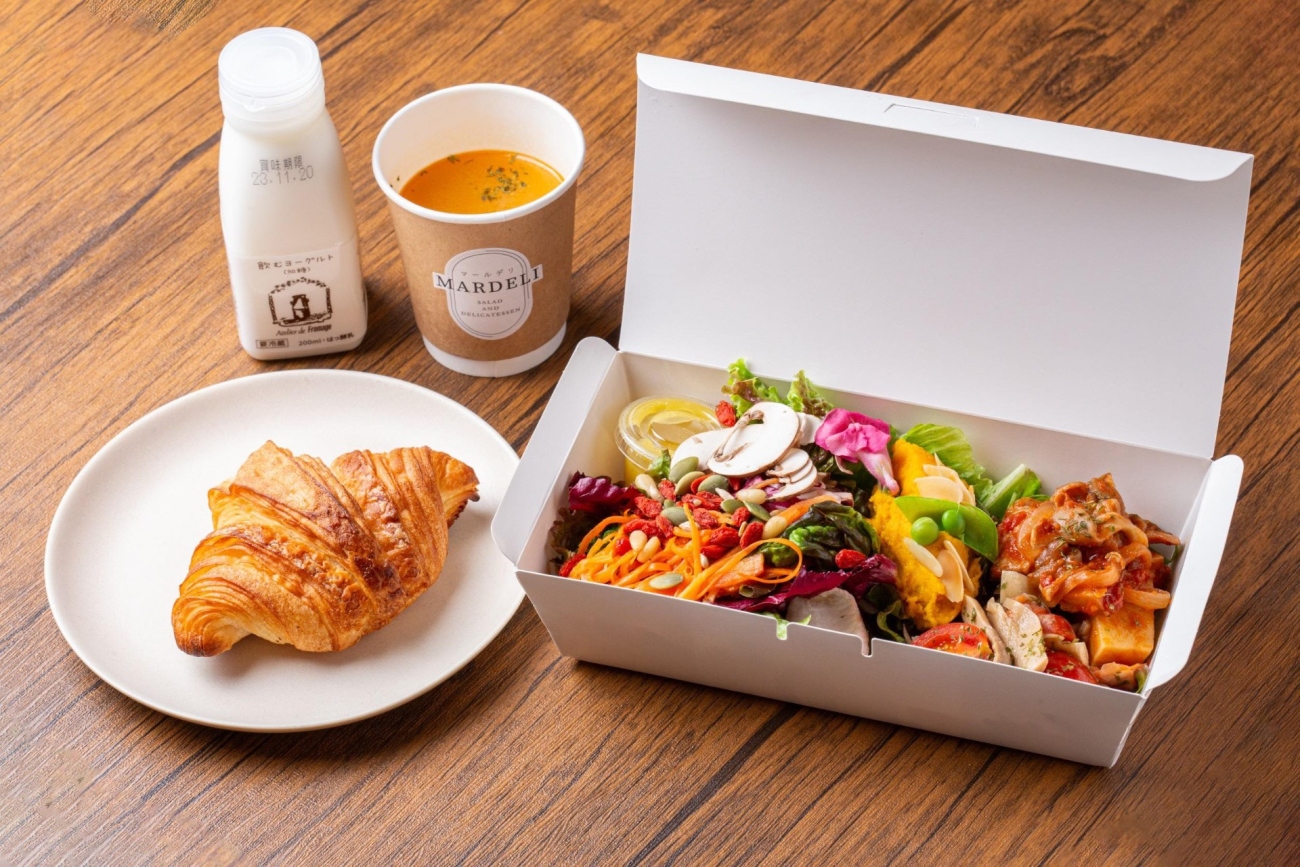 MARDELI(マールデリ)よりサラダ&デリBOX、パン、スープ、飲むヨーグルトのセットでございます。 葵ホテルオリジナルメニューとして、小麦だけじゃなく副材料まで全て国産使用のクロワッサン、日替わりスープ、飲むヨーグルトがセットになった「こだわる朝のフレッシュデリセット」をご提供します。